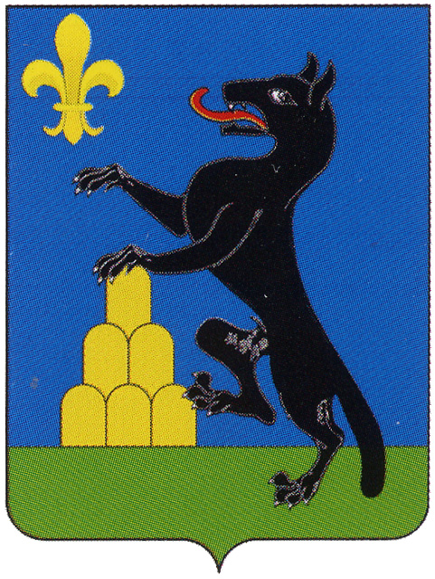 «В синем поле алчущий чёрный волк с красным языком, опирающийся левой лапой на золотую гору о шести вершинах, покоящуюся на зелёной уменьшенной оконечности, сопровождаемый золотой лилией в правом кантоне» /madzi с.304/