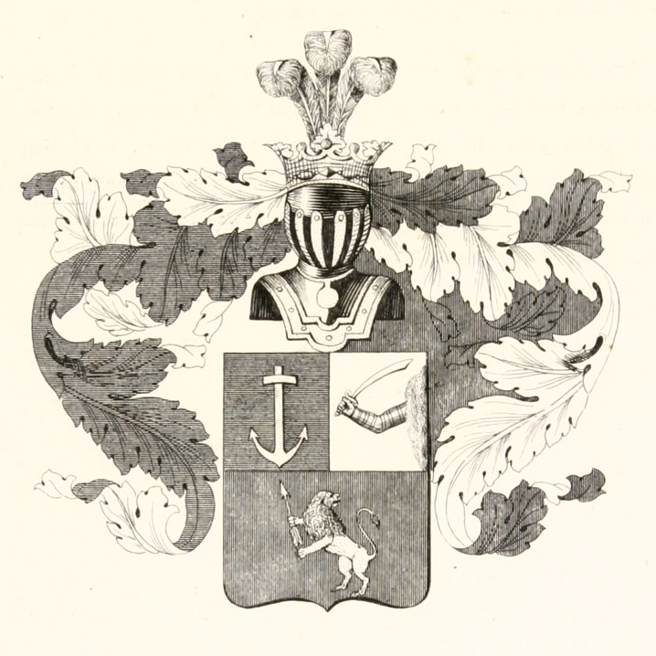 Щит разделен на три части, из коих в первой в голубом поле серебряный якорь; во второй в серебряном поле выходящая из облаков, облеченная в латы и держащая меч рука; в третьей пространной в красном поле золотый стоящий на задних лапах лев, обращенный в правую сторону и держащий в правой лапе серебряную стрелу, острием вверх. Щит увенчан дворянскими шлемом и короною с тремя на оной строусовыми перьями. Намет на щите голубый и серебряный, подложенный серебром и красным.