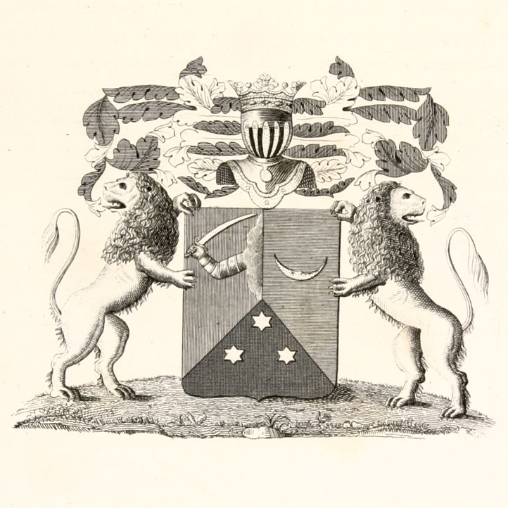 Щит разделен на три части до половины перпендикулярно, а к подошве щита правому и левому углам диогональными чертами, в коих изображены: в красном поле выходящая из облаков рука в серебряных латах с подъятым вверх мечом; во второй части в голубом поле золотый полумесяц, рогами обращенный вверх; в третьей части в черном поле три серебряныя шестиугольныя звезды. Щит увенчан дворянскими шлемом и короною. Намет на щите голубый и красный, подложенный серебром. Щит держат два льва.