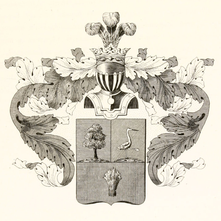 Щит разделен на три части, из коих в первом голубом поле изображено дерево дуб; во втором зеленом поле стоит журавль, обращенный в левую сторону, который держит в левой лапе камень; в нижней пространной части в красном поле хлебный золотой сноп. Щит увенчан обыкновенным дворянским шлемом с дворянскою на нем короною и тремя строусовыми перьями. Намет на щите зеленый и голубый, подложен золотом.