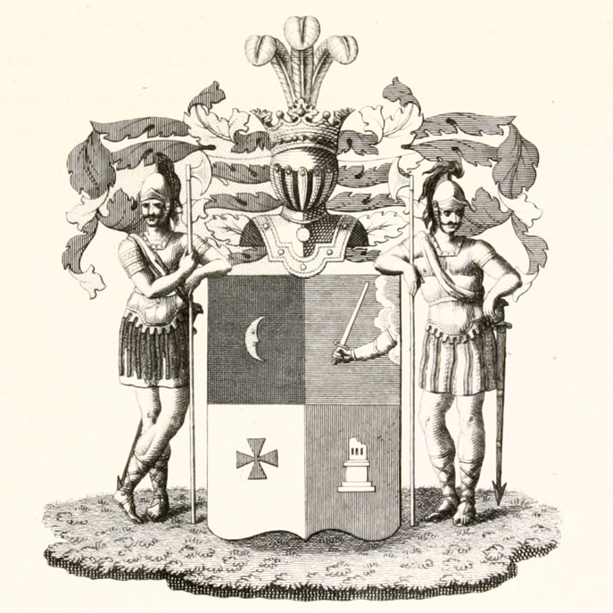 Щит разделен на четыре части, из коих в первой в черном поле находится золотая луна, рогами в левую сторону обращенная. Во второй части в голубом поле из облак выходящая рука в латы облеченная, держащая подъятый вверх меч. В третьей части в серебряном поле красный крест. В четвертой части а красном поле серебряная ломанная колона. Щит увенчан дворянским шлемом и короною, с тремя на оной строусовыми перьями. Намет на щите красный и голубый, подложен золотом и серебром. Щитодержателями поставлены два воина с секирами.