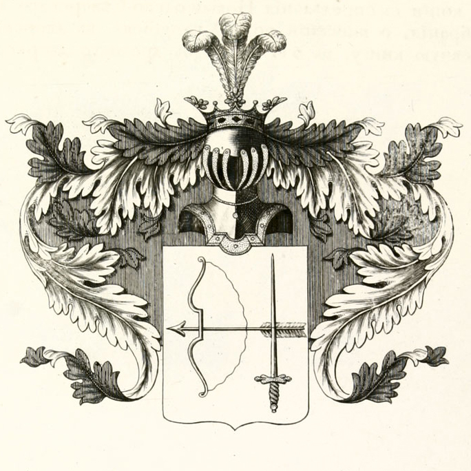 В Щите, имеющем серебреное поле, изображен Лук с Стрелою летящею в правую сторону, и Шпага поставленная остроконечием в верх. Щит увенчан обыкновенным дворянским Шлемом, с дворянскою на нем Короною и тремя Строусовыми перьями. Намет на Щите серебреный, подложенный красным. [1]