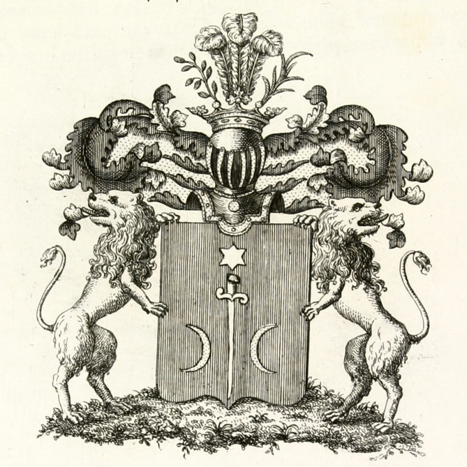 В щите, имеющем красное поле, между двумя золотыми Лунами рогами обращенными к бокам Щита, изображен серебряный Меч с переломленным Ефесом, над которым находится серебряная шестиугольная Звезда. Щит увенчан обыкновенным Дворянским Шлемом с Дворянскою на нем Короною тремя Строусовыми перьями, по сторонам коих видны Масличная и Пальмовая Ветви. Намет на щите красный подложенный золотом. Щит держат два льва смотрящие в стороны с загнутыми хвостами и выставленными языками. [1]